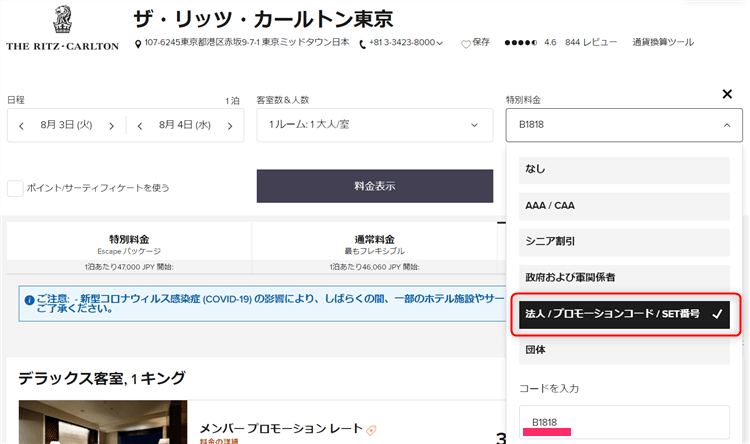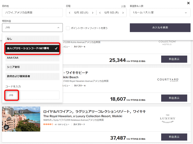 マリオット公式サイトで予約画面にて、特別料金をクリックして「法人/プロモーションコード/SET番号」を選択するとコード入力があるのでこちらに「JY6」を入れることで適用となります。