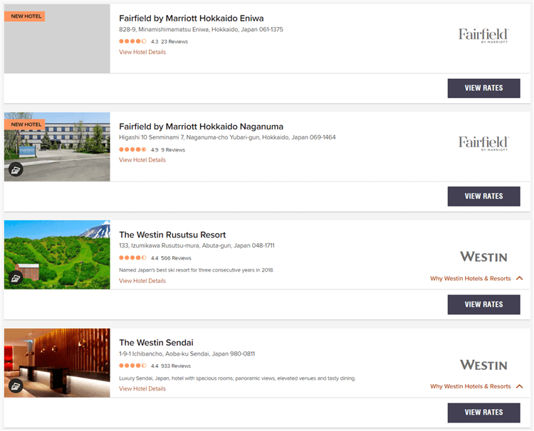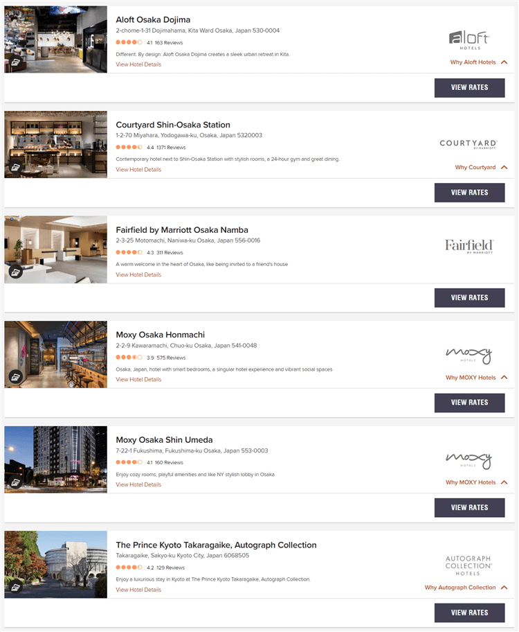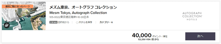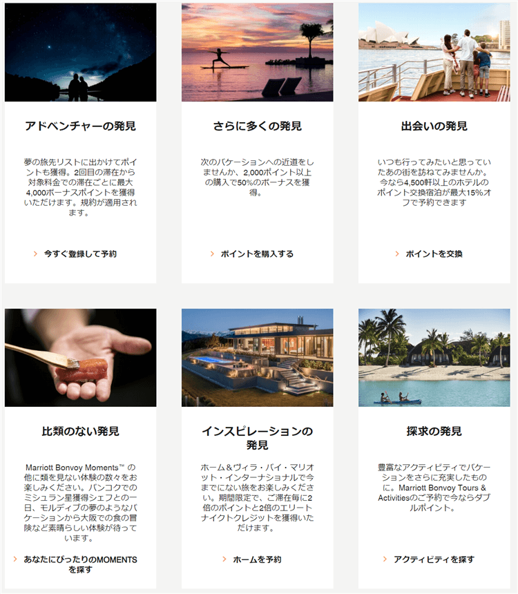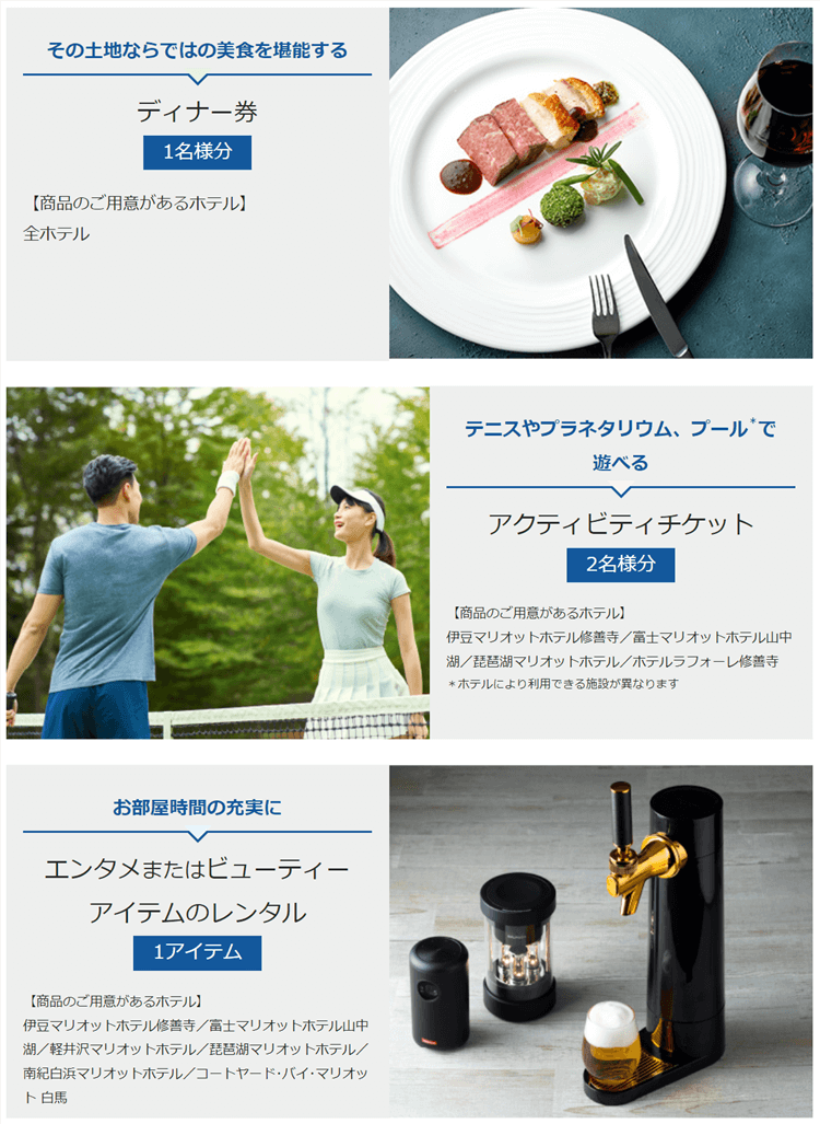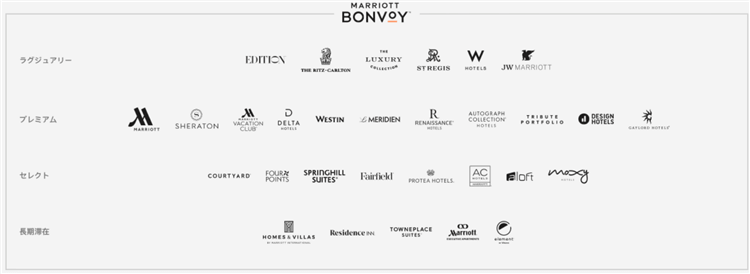 | プレミアム | マリオット、シェラトン、マリオットバケーションクラブ、デルタホテルズ、ウェスティン、メリディアン、ルネッサンス、オートグラフコレクション、トリビュートポートフォリオ、デザインホテルズ |