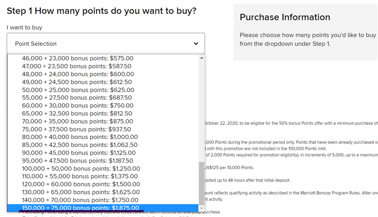 2022年、会員は、マリオットのウェブサイトの「ポイントを購入」および「ポイントを贈る」ページ (当サイトを含む)、Points.comによる「ポイントを購入する」ウィンドウ、マリオットモバイルアプリ、またはカスタマーエンゲージメントセンターを通じて購入された場合、1暦年に合計100,000ポイントまで、ポイントを購入またはギフトとして受け取ることができます。