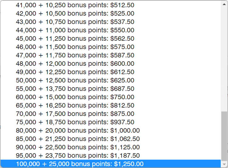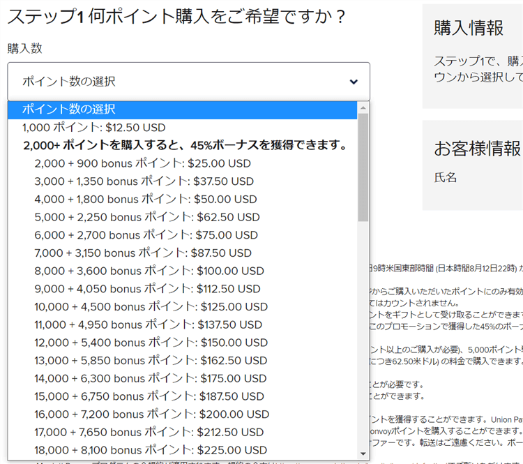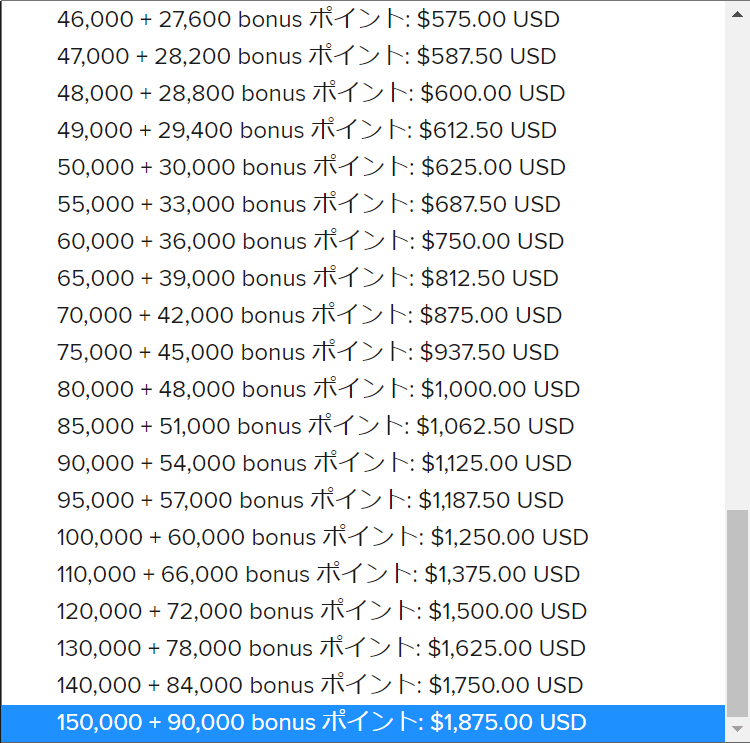 マリオットのポイントですが基本1,000ポイント=12.50米ドルで購入が出来るようになっています。