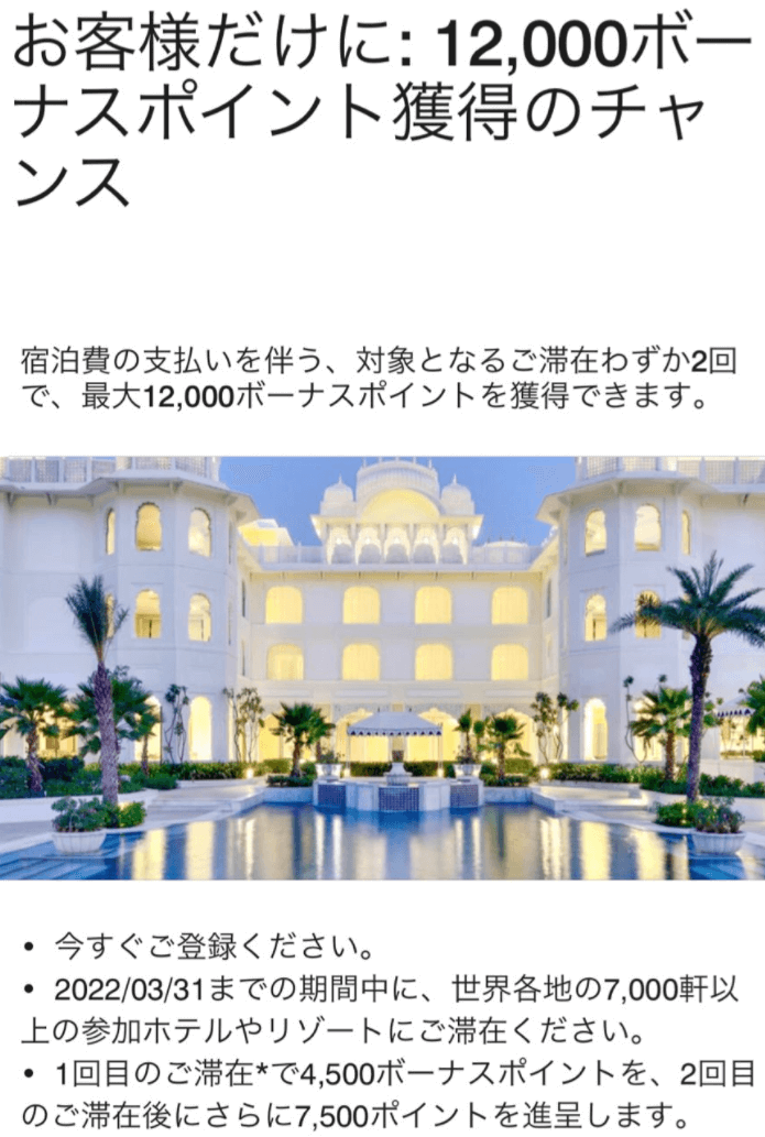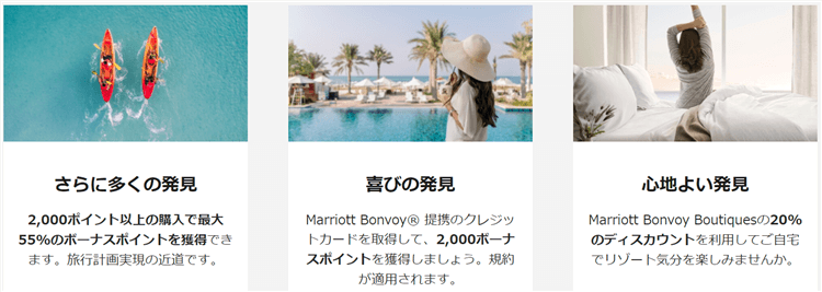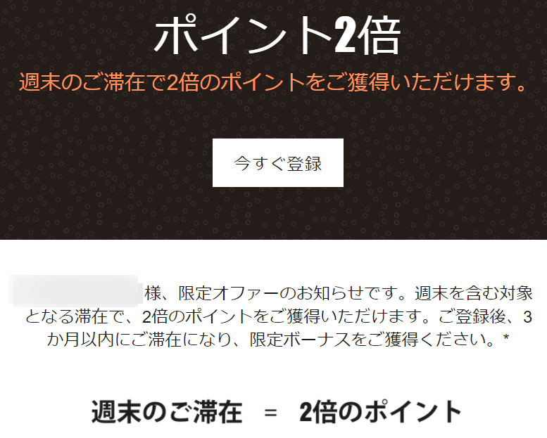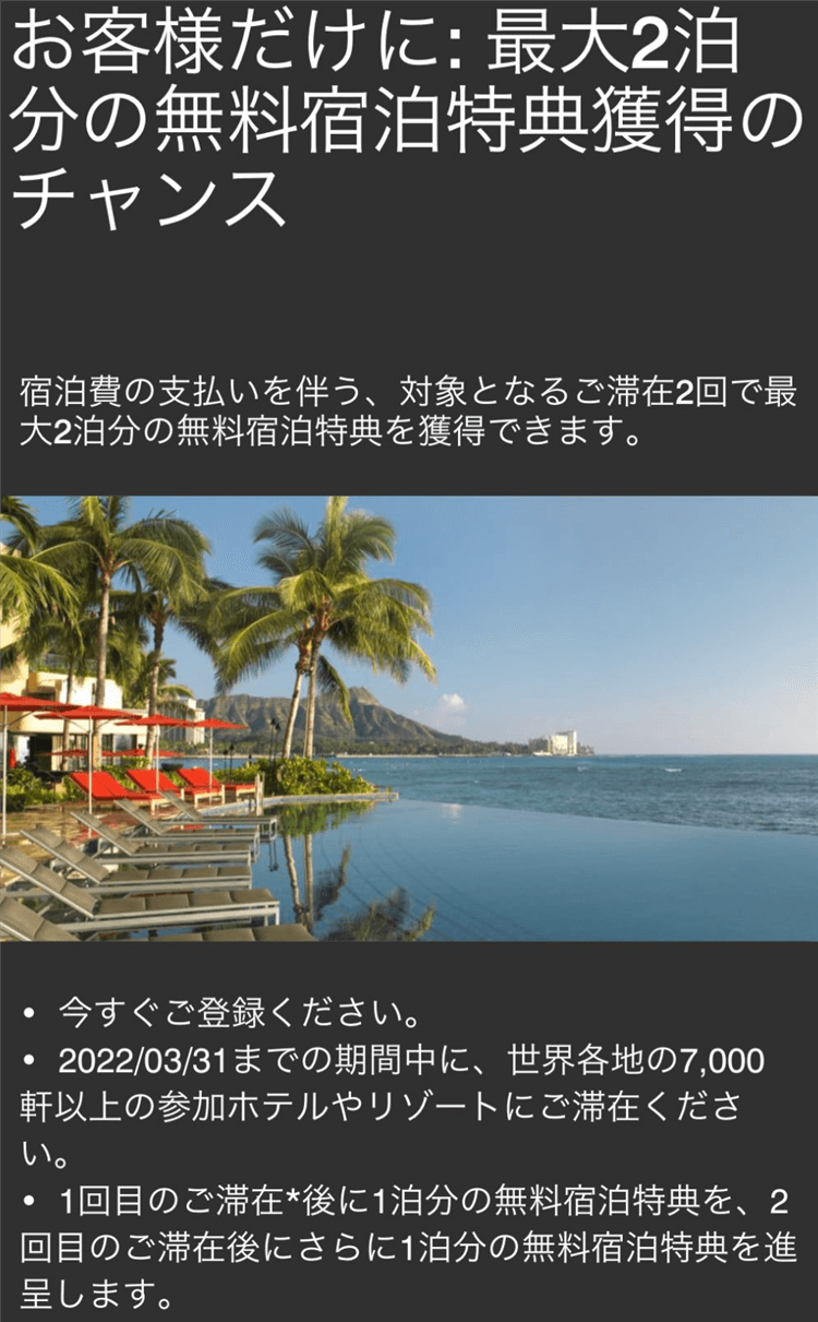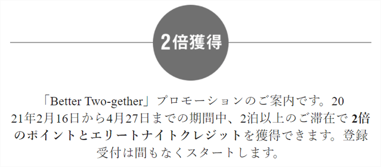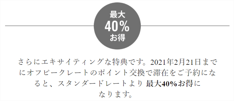 ボーナスポイントが貰えたり、割引でホテルステイができたりという素晴らしいキャンペーンとなります。