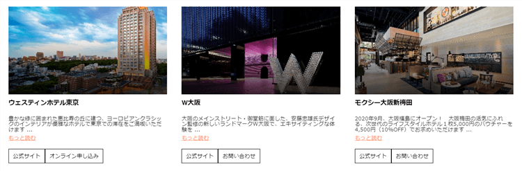 | 長期滞在 | ホテル&ヴィラズ、レジデンスイン、タウンプレイススイート、マリオット、エレメンツ |