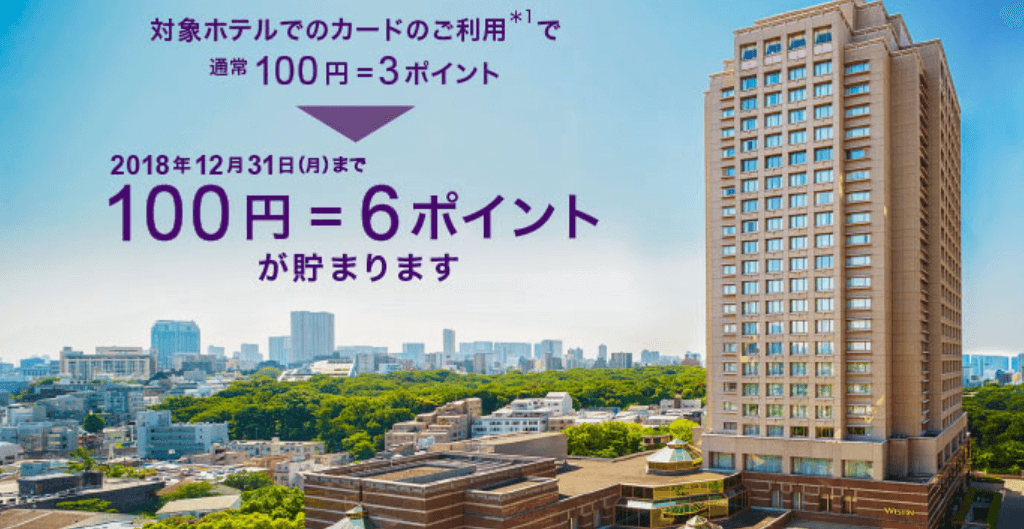 2018年12月31日(月)まで、SPG/マリオット リワード参加ホテルでの対象となるお支払い代金(*1)にスターウッド プリファード ゲスト アメリカン・エキスプレス・カードをご利用いただくと通常ご利用金額100円につき3ポイントのところ、6ポイントが貯まります。