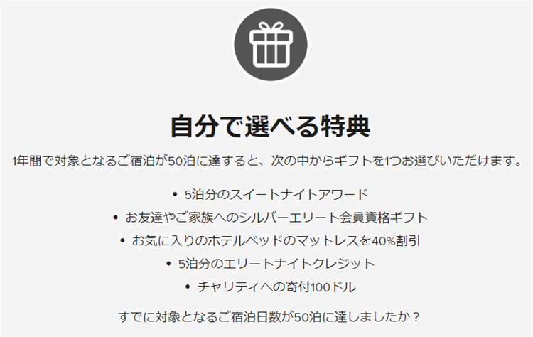 | エリート資格の各条件 | 10~24泊 | 25~49泊 | 50~74泊 | 75~99泊 | 100泊+$20,000 |