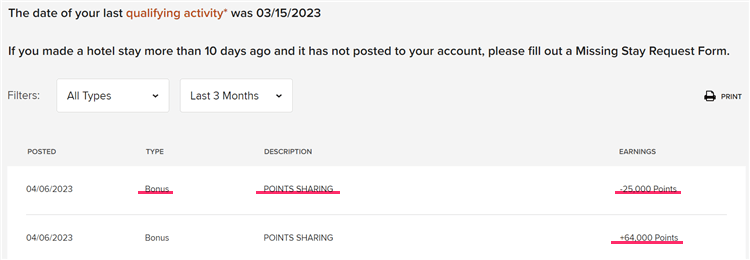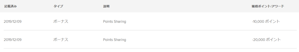 ポイントシェアの明細ですが、ポイントタイプは「Bonus」扱いとなり、明細は「POINTS SHARING」の記載がありますね!