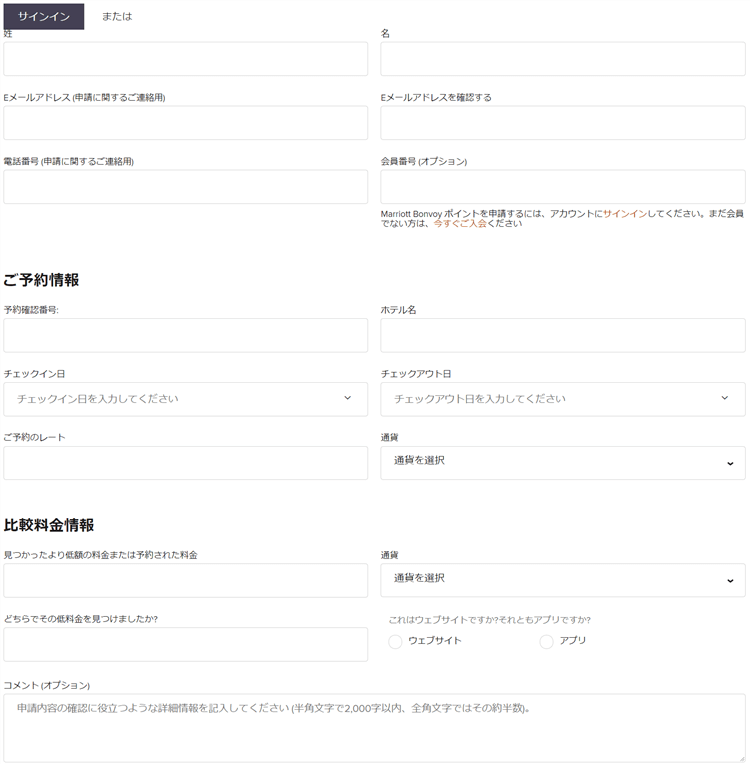 上記はベストレート保証リクエストのフォームとなっています。https://www.marriott.co.jp/look/claimForm.mi