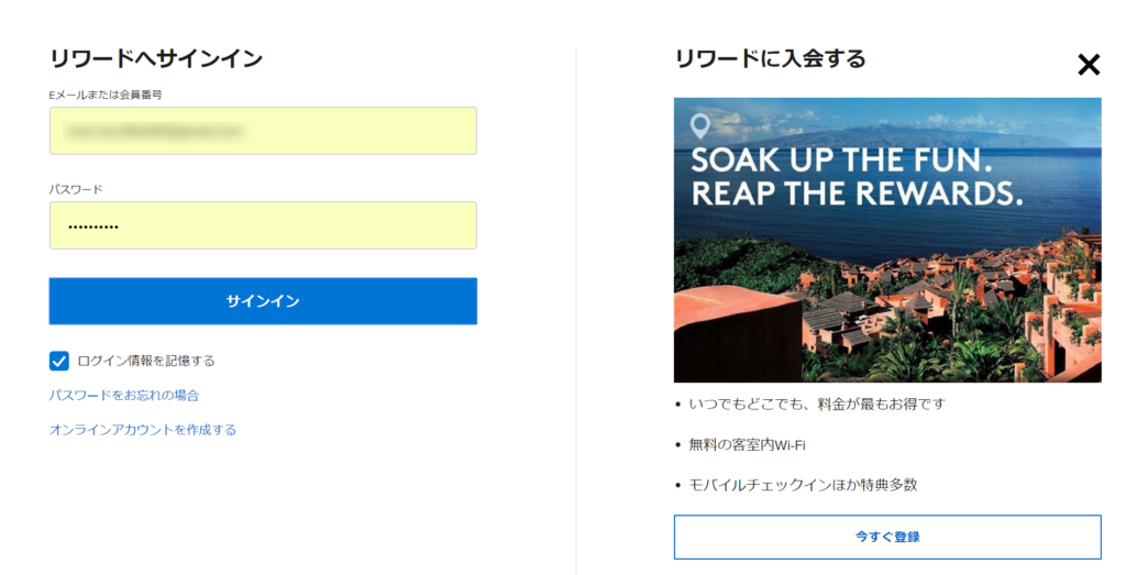 登録Eメールもしくは新しい会員番号を記入して、パスワードを入れてサインインしましょう。