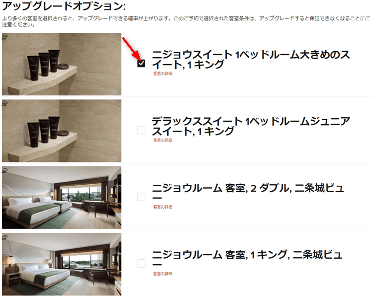 なぜかというと、当日の空室状況に左右されるものなので空きがない場合はスイートルームへのアップグレードはありません。