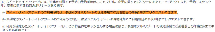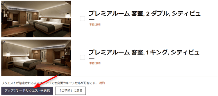 Nightly Upgrade Awardsのリクエストおよび確定は、ホテル現地時間でご到着日の前日午後2時までとなっております。