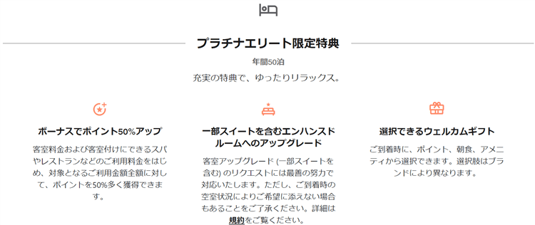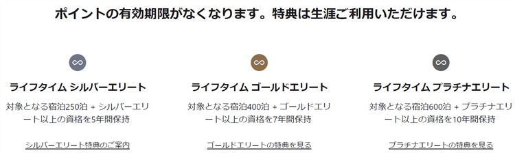 そして先ほど伝えたライフタイムですが、こちらはプラチナエリートを10年キープしつつ累計600泊が必要です。