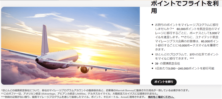 マリオットポイントは60,000ポイント単位での交換であればいくつかの航空会社だとボーナスマイルが付くからなんですよ。