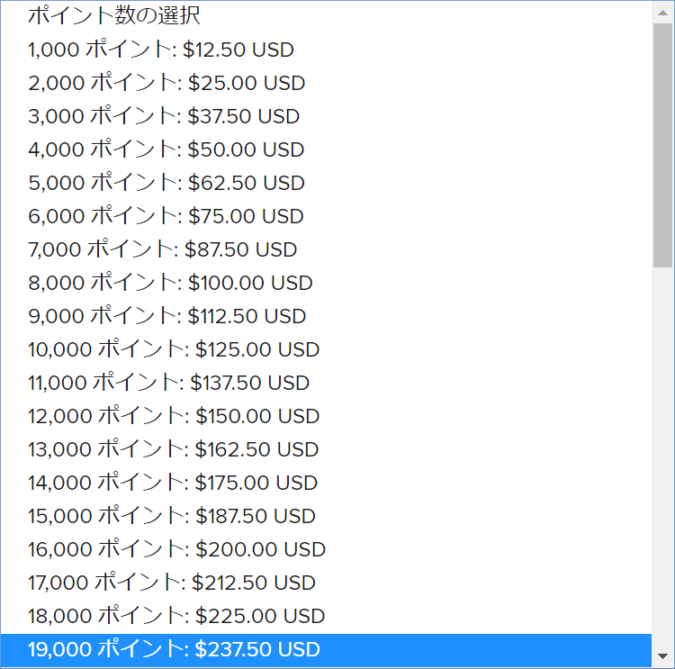 どのポイントを購入しても1,000ポイント=12.5米ドルとなります。