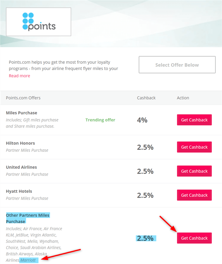 Marriottの箇所があるのが分かりますか?こちらが対象のリンクとなるので、こちらの「Get Cashback」をクリックするとPoints.comのサイトページが出てきます。