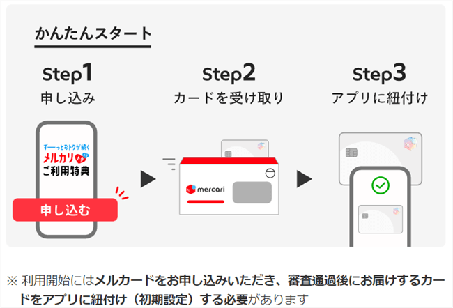 「POINT GET!」をクリック→(メルカリアプリをお持ちでない方は遷移先からインストール)→「メルカードを申し込む」をクリック→入力フォーム(お客様情報やご職業など)を入力→入力内容の確認→申込完了→審査→カード発行→カード受け取り→完了!【お問合せについての注意事項】