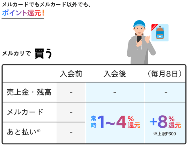 しかし!メルカリ利用時ですが利用実績に応じて最大4%還元まで上がるようになります!!