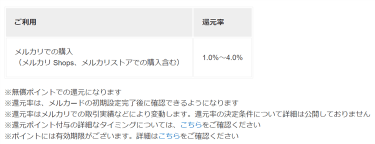 そしてメルカードで貯まるポイントは基本的には1%還元となります。