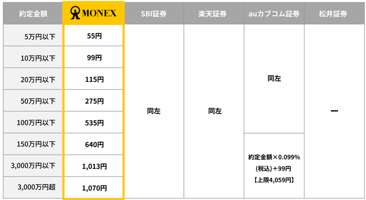 マネックス証券は大手ネット証券会社と同じ手数料となっています。