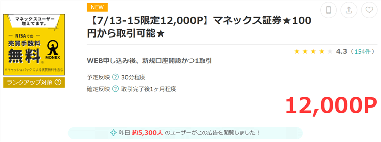モッピーでマネックス証券新規口座開設と1取引で12,000P貰えるキャンペーン!