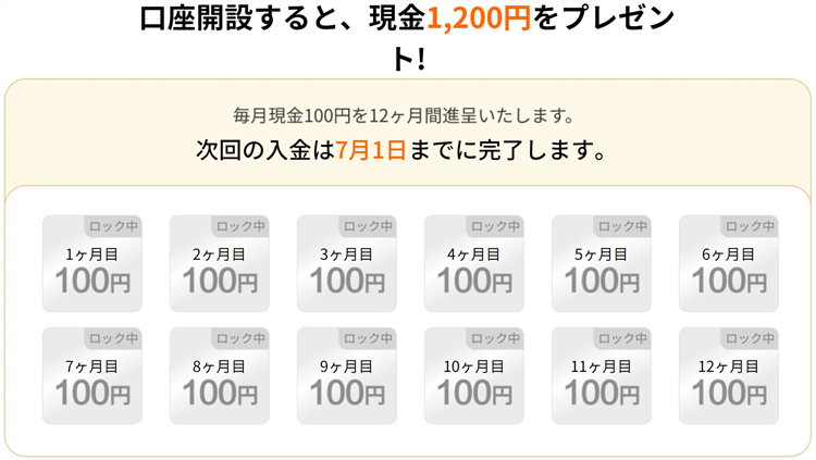 ・プログラム期間中、口座開設条件を満たしたお客様へ合計1,200円分(毎月1回100円ずつ、12カ月に分けて入金)の現金券を進呈します。