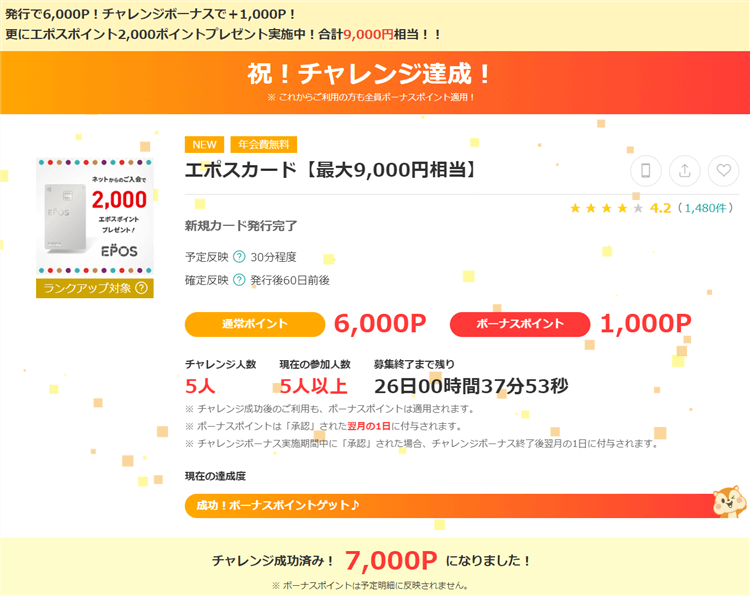 - 達成期限までにお友達がモッピーで5,000P以上のポイントを獲得すると、2,000Pプレゼント!