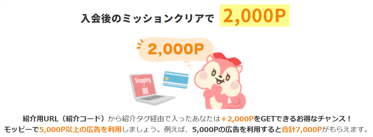 モッピーへ入会すると今なら更に!!2,000Pが貰えます!!