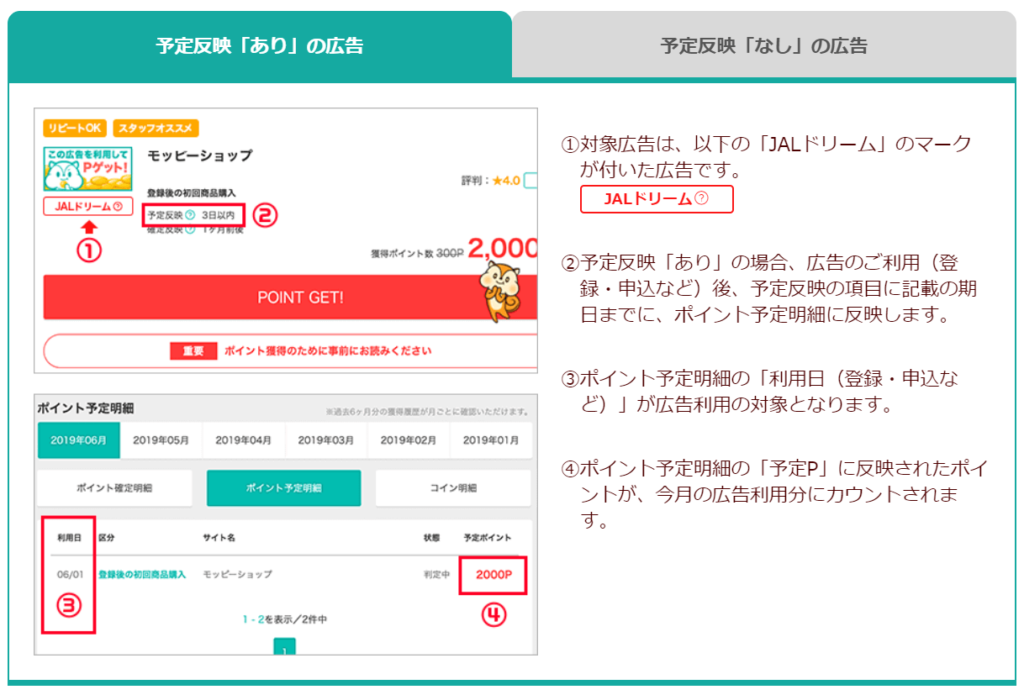 ・予定反映のある広告は、登録・申込時点の予定反映ポイントが対象となります。