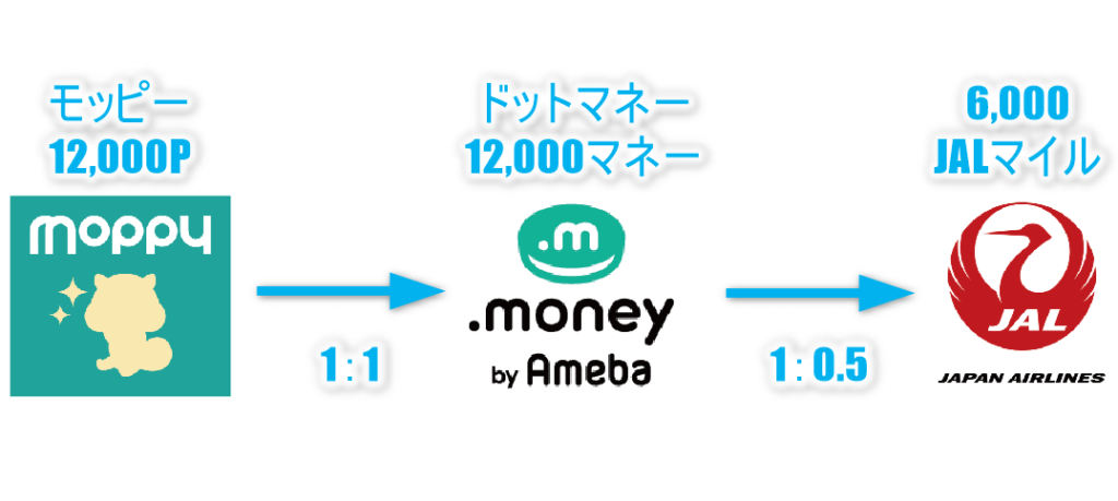モッピーからドットマネーを経由してJALマイルへ交換50%