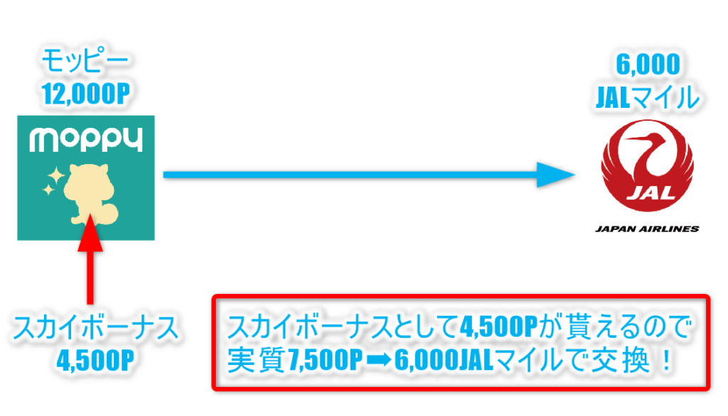 - モッピーポイントを12,000PをJALマイルに交換すると後日4,500Pが還元!
