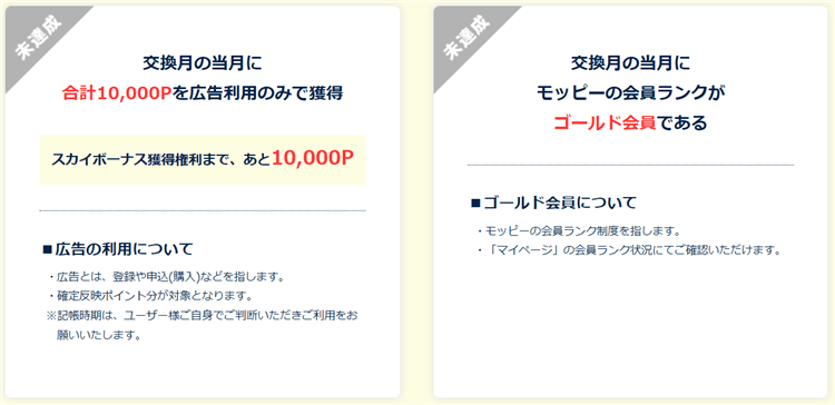 - 交換月の当月にモッピーの会員ランクがゴールド会員である