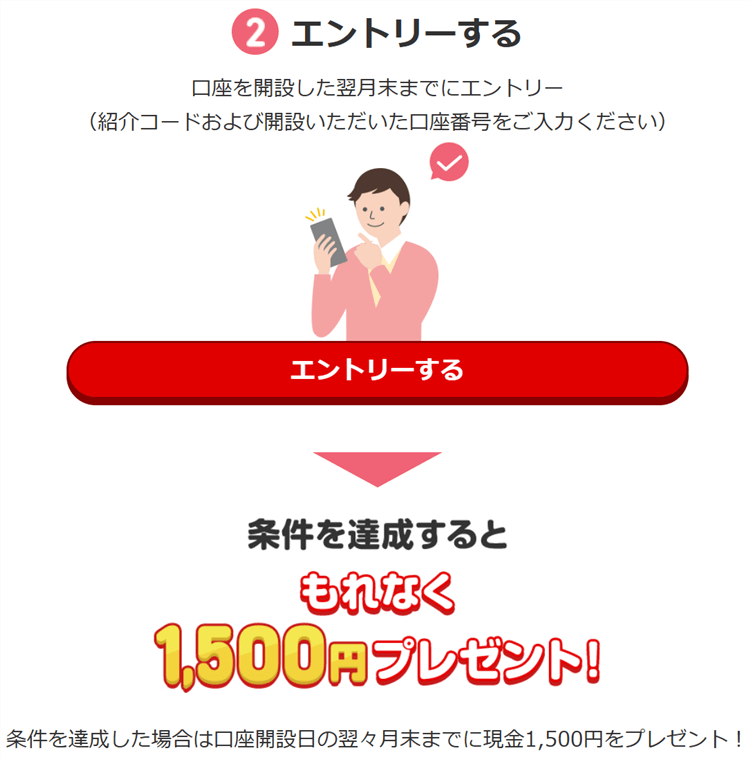 利用方法は口座を開設した翌月までにエントリーすると1,500円がプレゼントされますよ!!