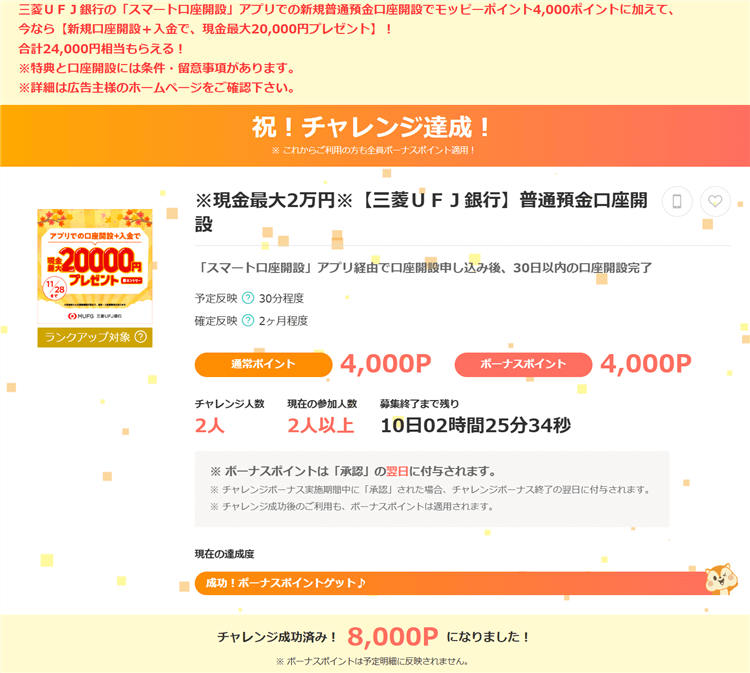 三菱UFJの普通預金口座開設するだけで4,000→8,000ポイント!良いですね~!!