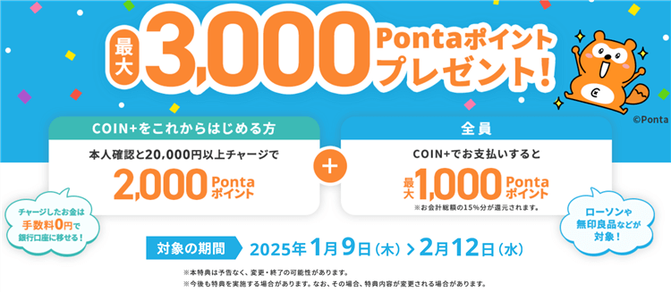- COIN+の支払いで15%還元(6,667円まで):最大1,000Pontaポイント