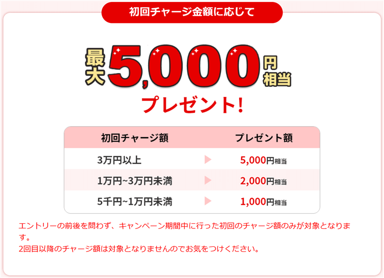 こちらは3万円以上のチャージをすることで5,000円が貰えちゃいますよ!