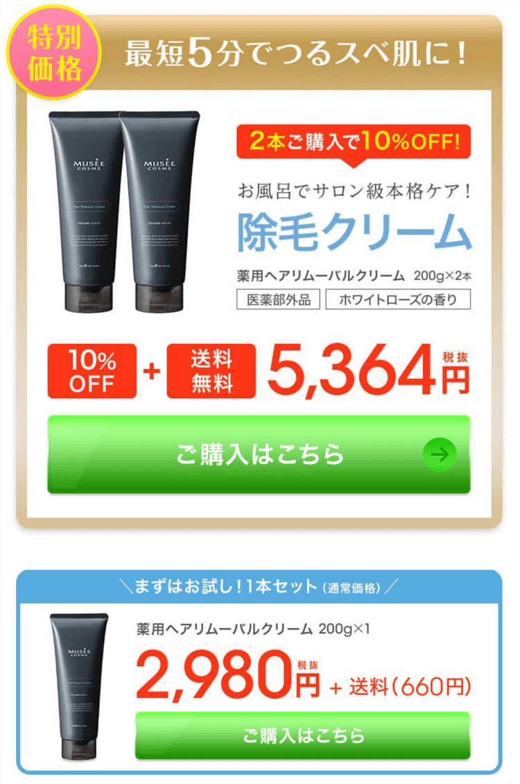 対象商品:除毛クリーム「薬用ヘアリムーバルクリーム」※過去に「ミュゼコスメ」で他商品を購入されたことがある方でも、初めて「薬用ヘアリムーバルクリーム」を購入される方は対象です。