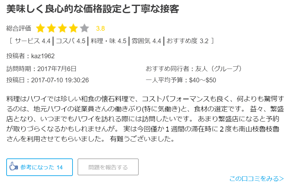 ハワイの中でも非常に人気の高い南山枝魯枝魯(ナンザンギロギロ)ですが口コミも調べてみると非常に多いですね!!