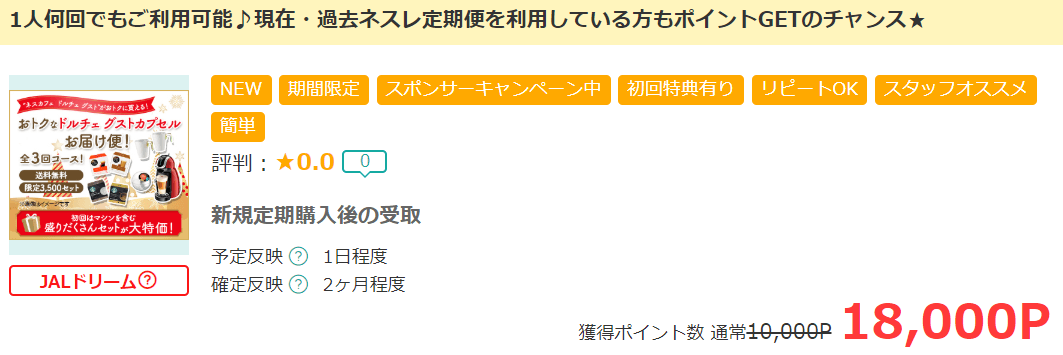 こちらですが、ネスレの定期購入利用で18,000Pが貰えちゃいます!!1P=1円なので18,000円が貰えちゃうというわけなんです。