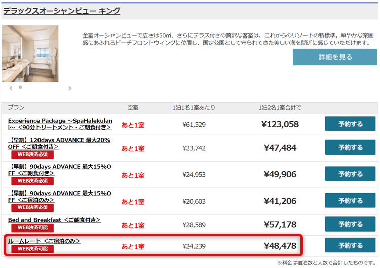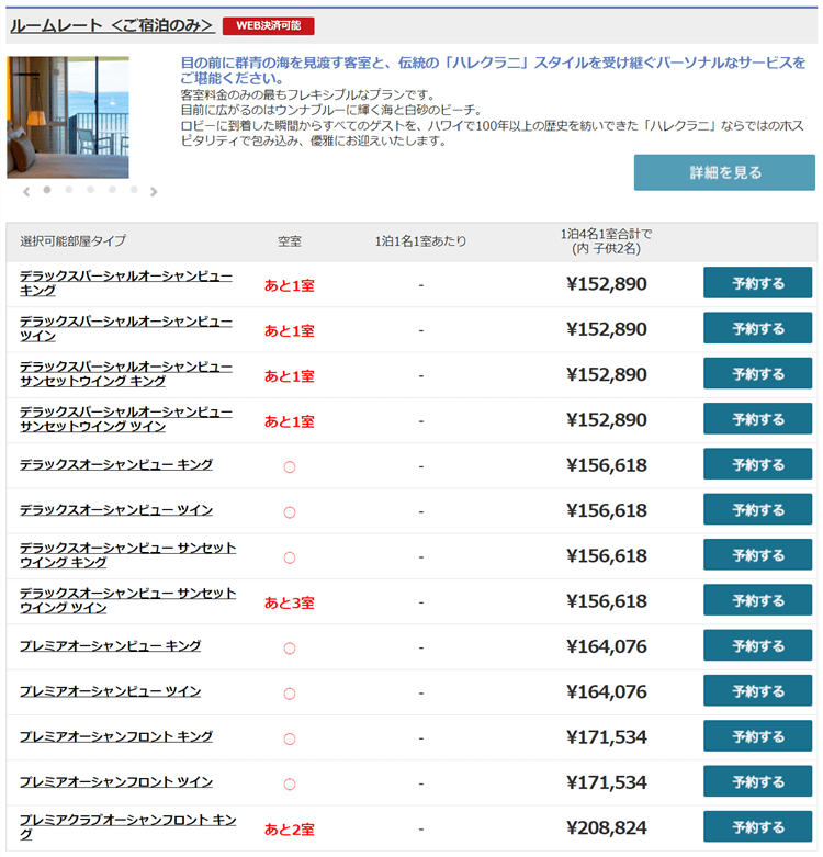 ※オーシャンテラス、ハレクラニ、オーキッドスイートは予約検索ではすべて満室となっています。