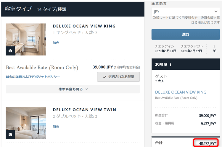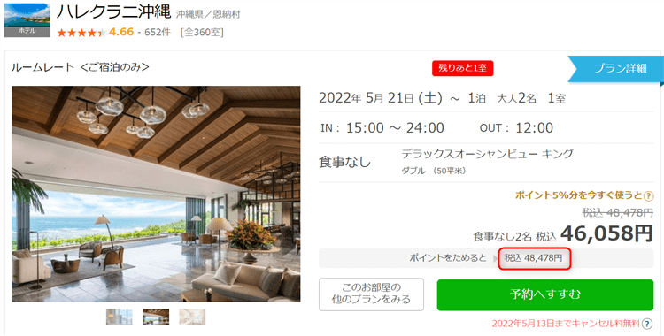 同じ条件で1泊2日だと48,478円ですね。ほぼ同じです。