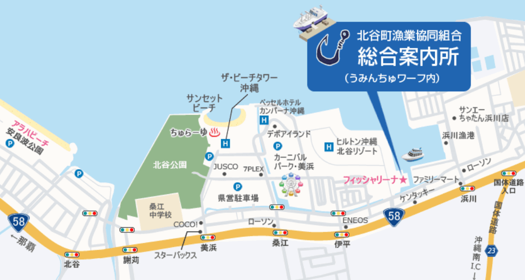 「北谷漁業協同組合 総合案内所」が運営している北谷町フィッシャリーナ地区、うみんちゅワーフ館内では様々なマリンスポーツが楽しめるようになっています。