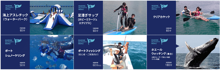 海上アスレチックや、定番のシュノーケリングやボートフィッシングなど大体のマリンアクティビティが満喫できますよ!