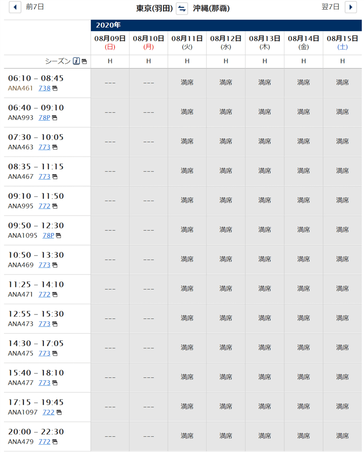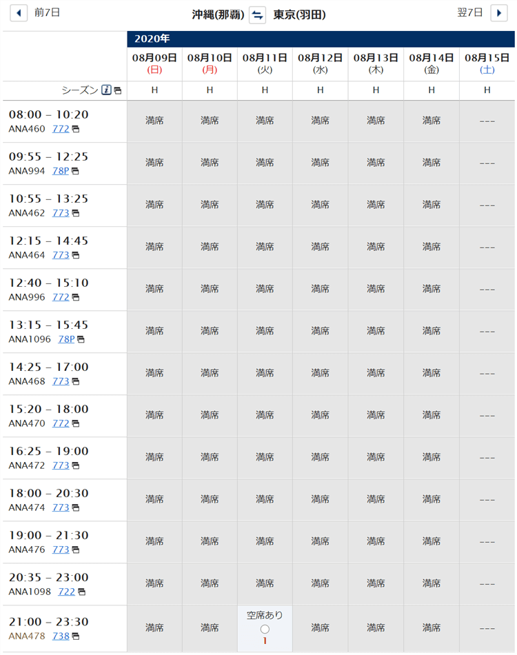 ANAの場合、復路で8/11の最終便で空席が僅か1席ですね(笑)