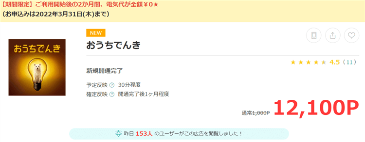 「おうちでんき」への切り替えで電気代2か月無料で12,100P(12,100円相当)が貰える超爆益!!