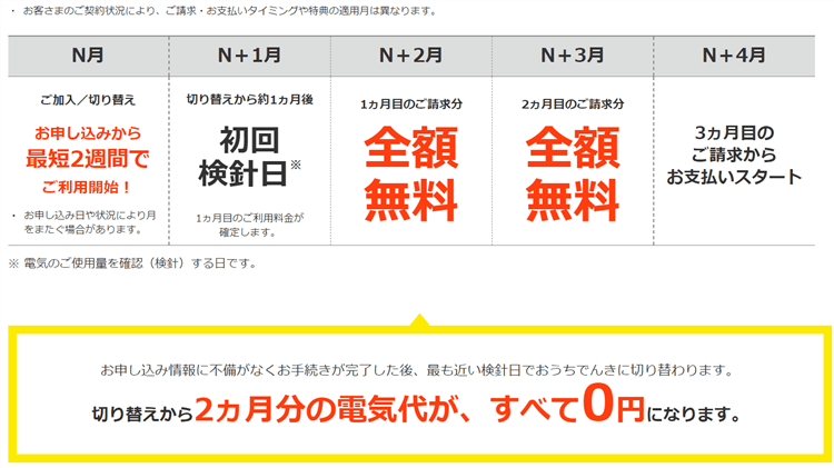 そして更にその翌月に1か月目の料金が請求されるのですが、そこから2か月分の電気料金が全額無料となります。