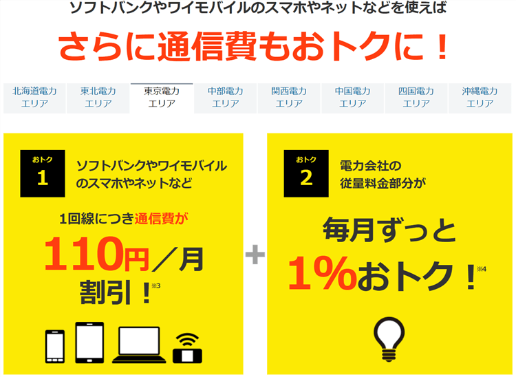 ※3 おうちでんきにご加入の場合、ご契約の携帯電話・タブレット・固定通信サービス10回線まで1回線ごとに110円/月割引(2年間)が適用となります。3年目以降の割引金額は55円/月です。