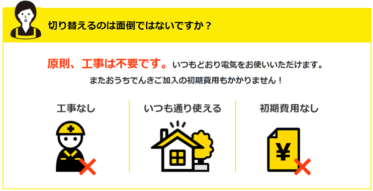 そして電力会社を切替するのって、知らない人からすると工事が必要なんじゃないかって思う人もいるのですが、実は工事は不要なんです!