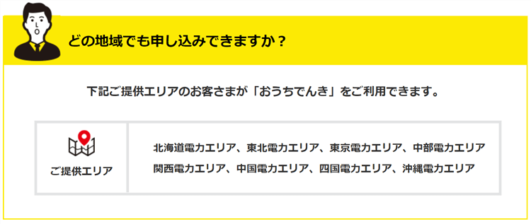 - 北陸電力エリア、九州電力エリアはおうちでんき提供エリア外です。