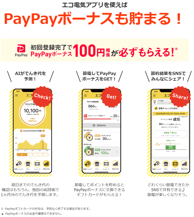 エコ電気アプリを利用するとPayPayボーナスも貯まる!初回登録完了で100円貰える!!