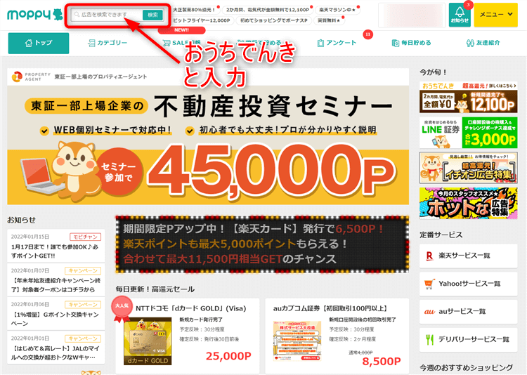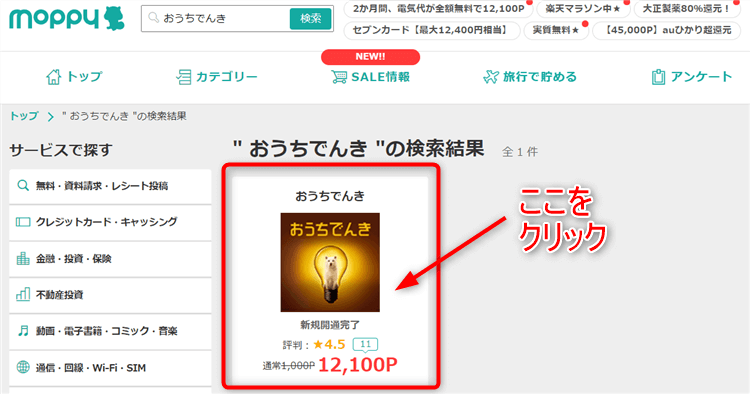 TOPページから検索バーで「おうちでんき」と検索をしてください。この時に「サービス検索」を選択して検索してくださいね!