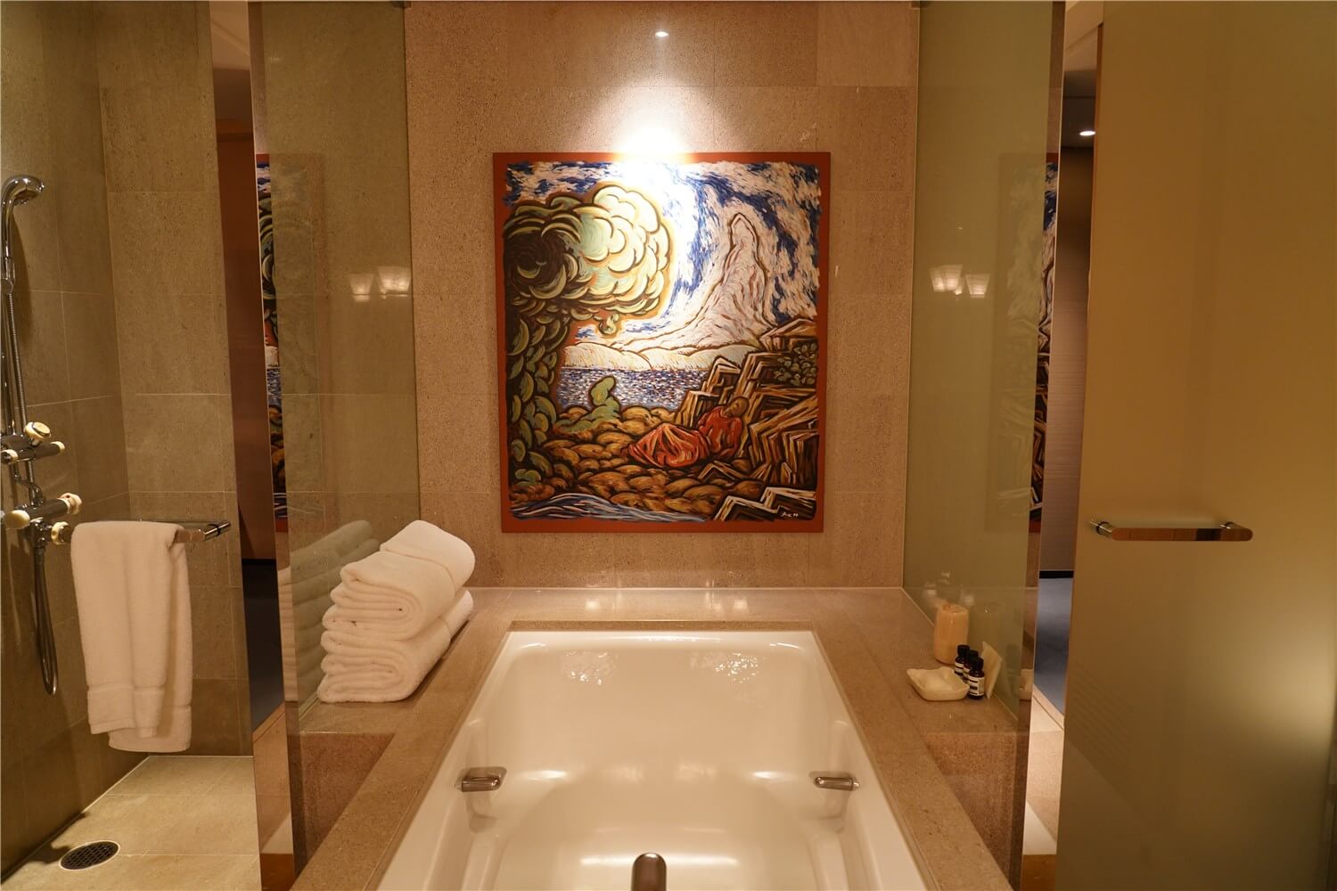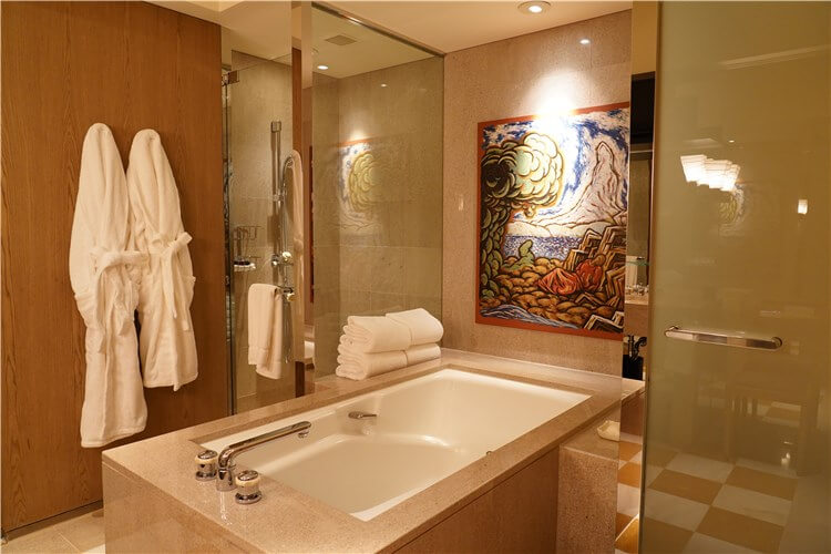 中央にドーン!とバスタブが鎮座しており、こちらに寝そべってテレビを見たり、することが出来るようになっています。