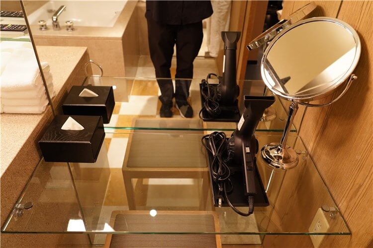 そして右手にはガラステーブルの上にドライヤーに鏡。